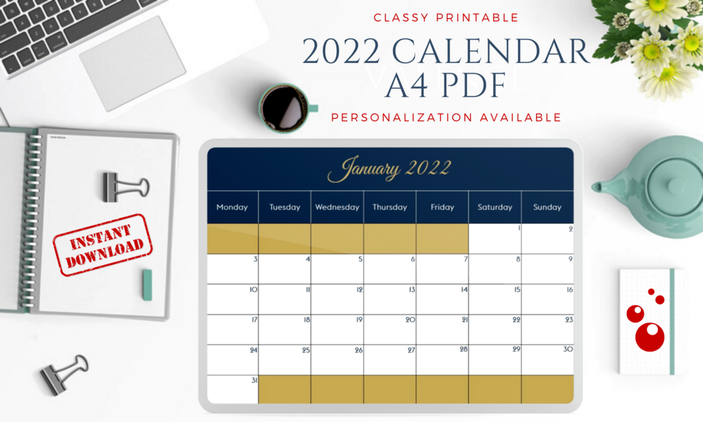 The purchase includes a 2022 monthly calendar in A4 landscape PDF format.