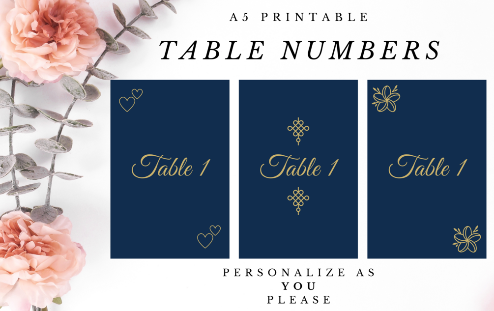 Printable Table Numbers | A5 portrait PDF | Blue & Gold | Digital Downloaded File | Personalizable